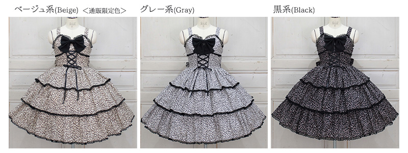 This JSK is made from leopard print fabric and features a corset-like bodice and a short skirt with three tiers of ruffles, adding a bit of spice to the design.