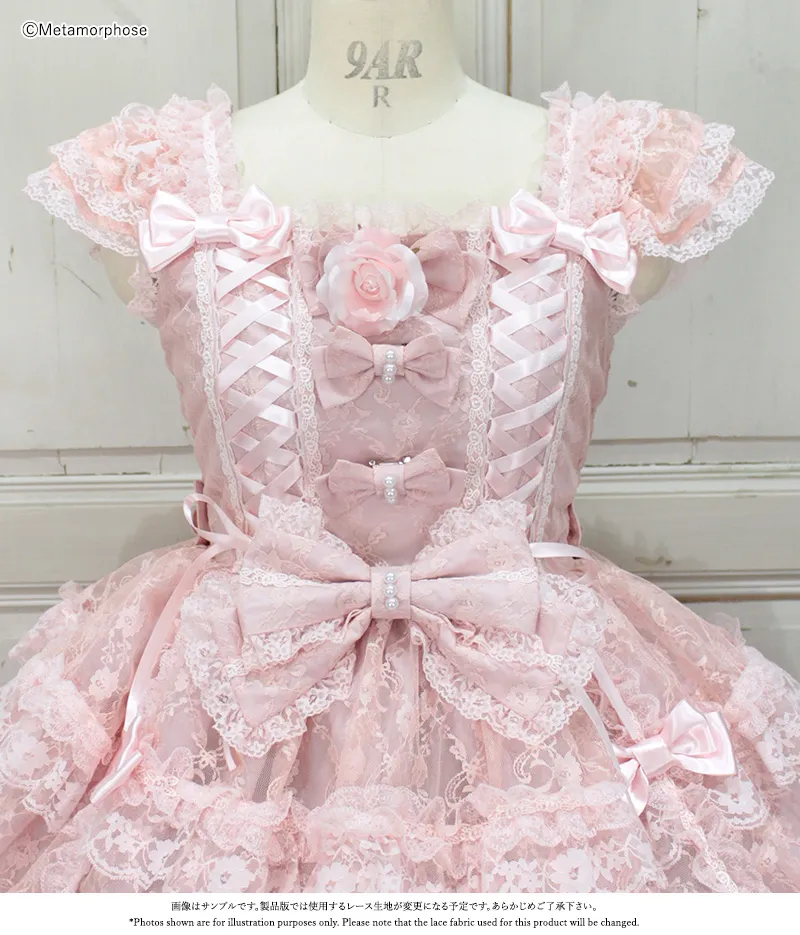 後ウエストリボン、肩フリル、前ウエストリボンブローチ(大)、造花付きリボンブローチ(中)、前身頃リボンブローチ(小)×2