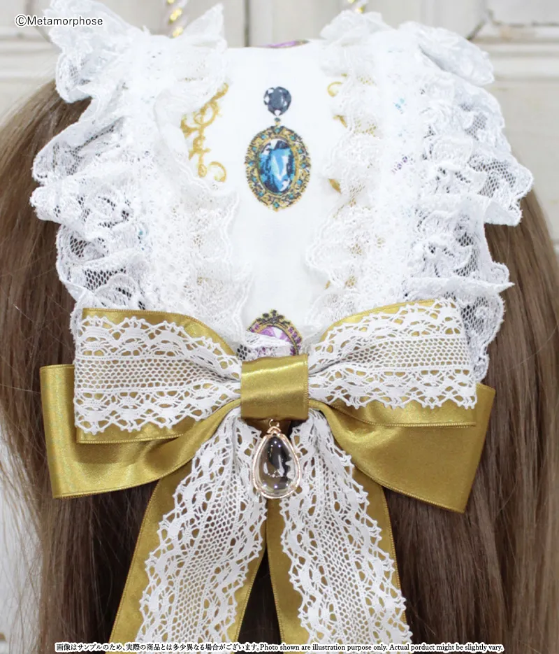 きらきらと輝く宝石がプリントされた生地の煌びやかさを引き立てるように、繊細なチュールレースにたっぷりとギャザーを寄せたヘッドドレスです。