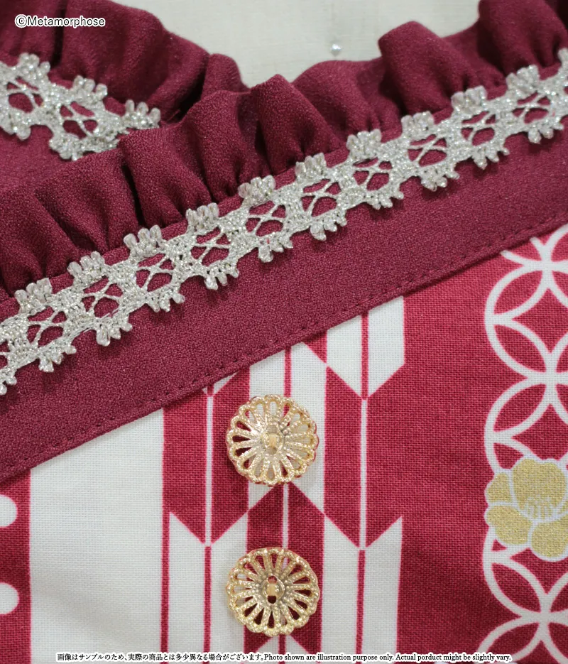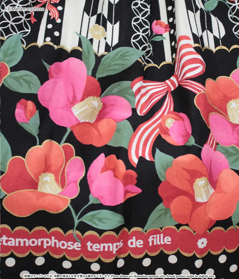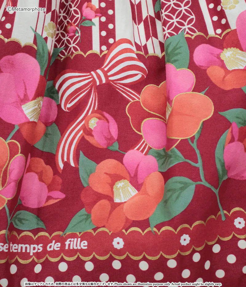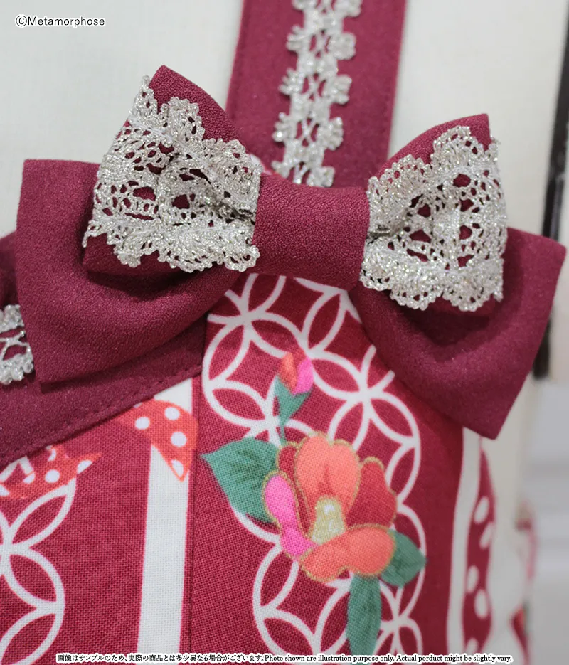オリジナル<おとめの恋つばき>プリント生地(綿100%)、別布:アムンゼン(ポリエステル100%)、裏地(ポリエステル100%)、トーションレース、ラメトーションレース