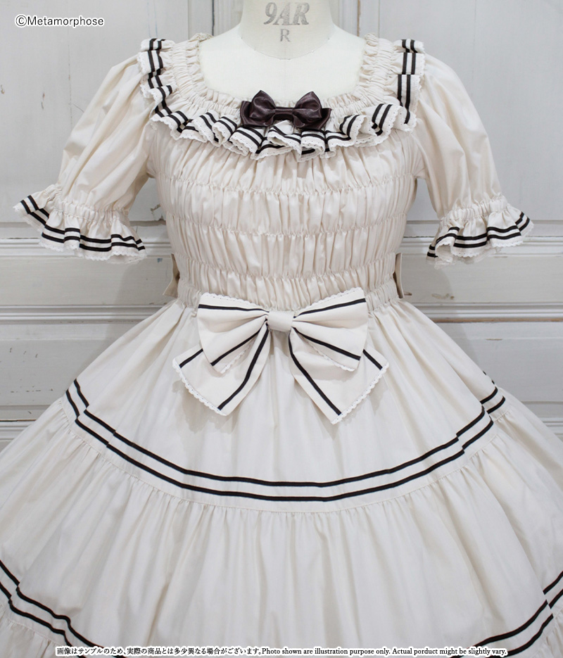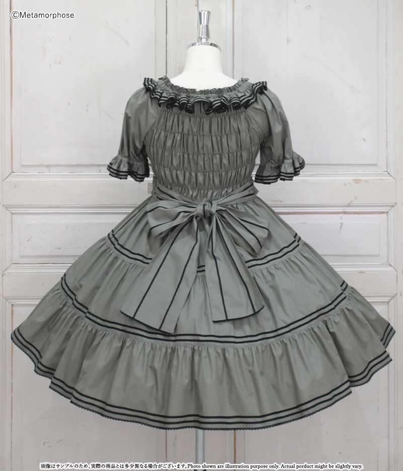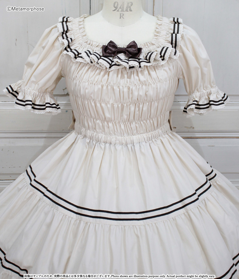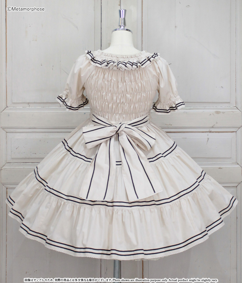 シャーリングの身頃に3段ティアードのスカートで、ロリータちゃんらしいフィット&フレアのシルエットをセーラーテイストで仕上げたワンピースです。