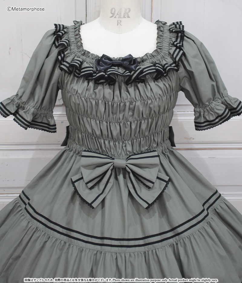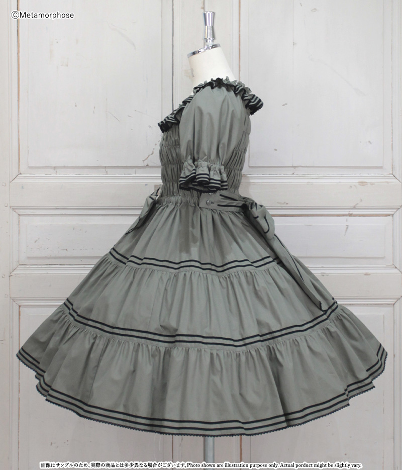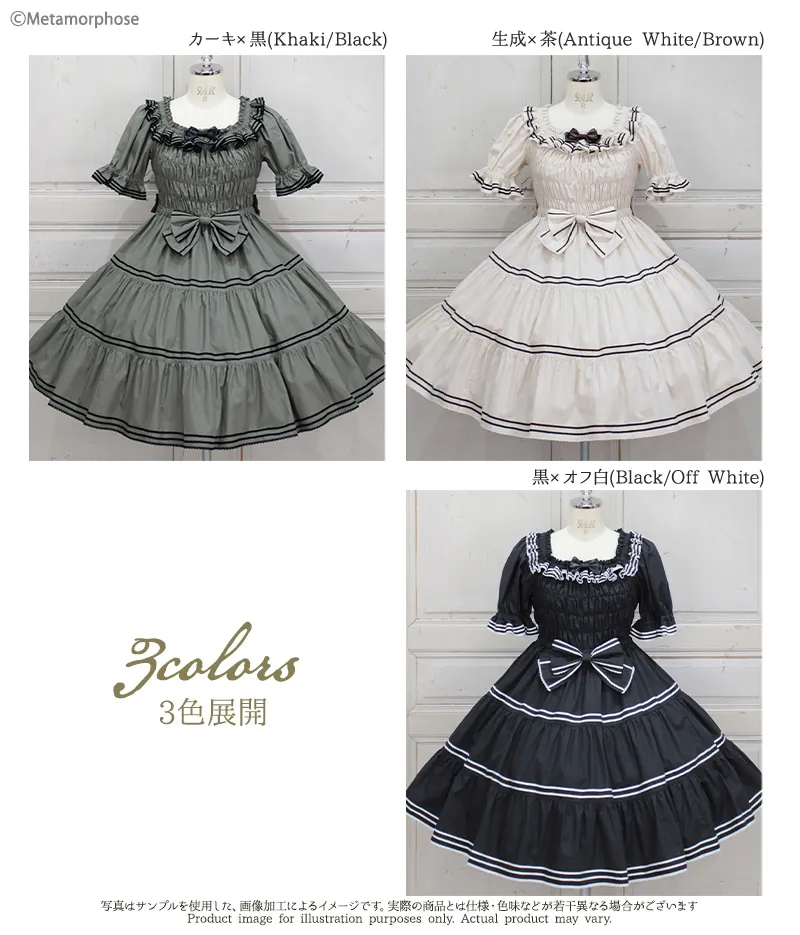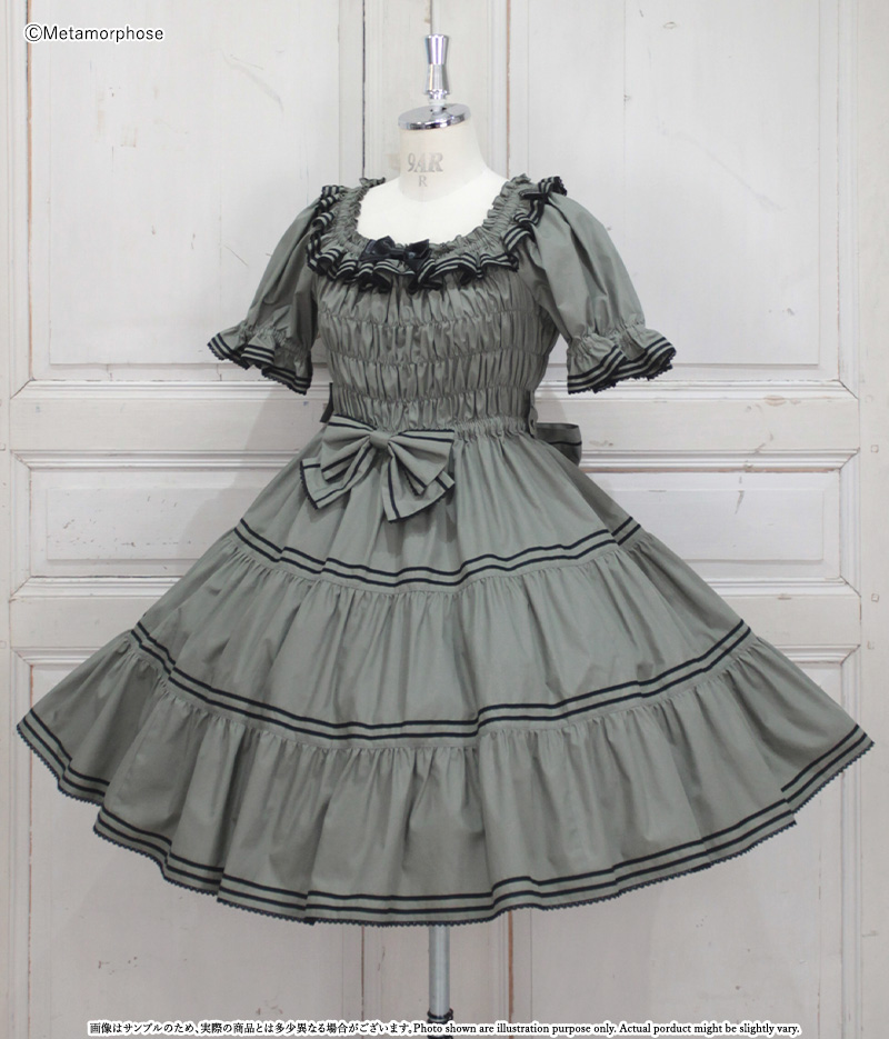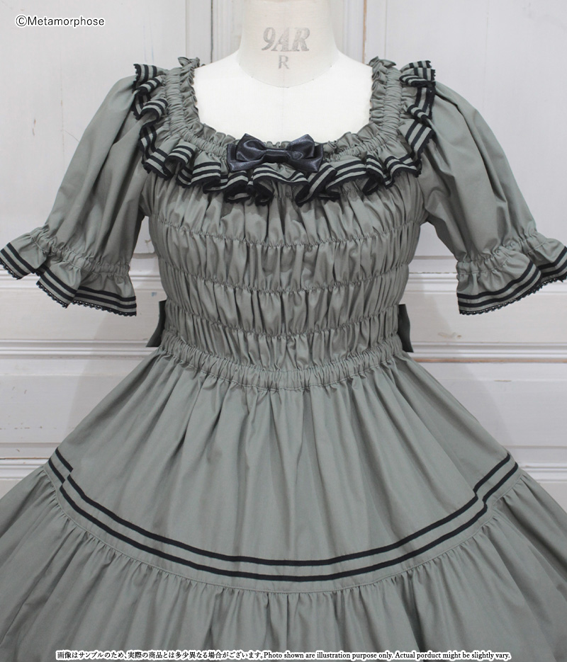 シャーリングの身頃に3段ティアードのスカートで、ロリータちゃんらしいフィット&フレアのシルエットをセーラーテイストで仕上げたワンピースです。