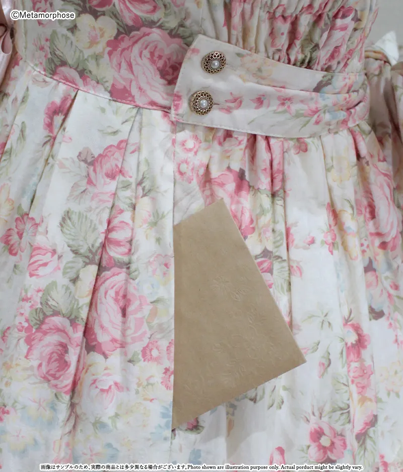 花柄プリント(綿100%)、トーションレース、ケミカルレース、ラッセルレース、サテンリボン、パール調メッキ釦、バラチャーム