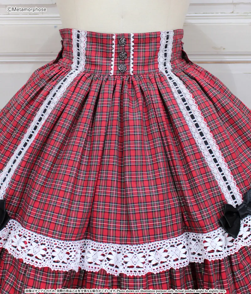 ・赤チェック×オフ白レース×黒リボン×黒釦×シルバーブラックバラ型釦