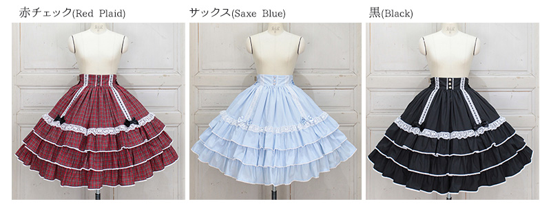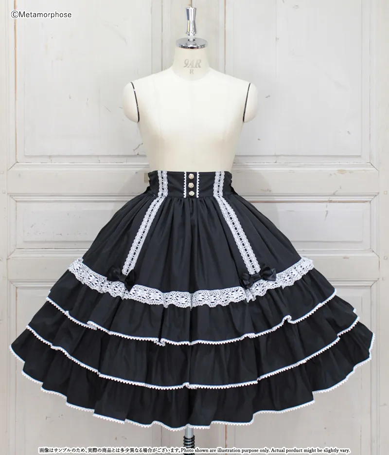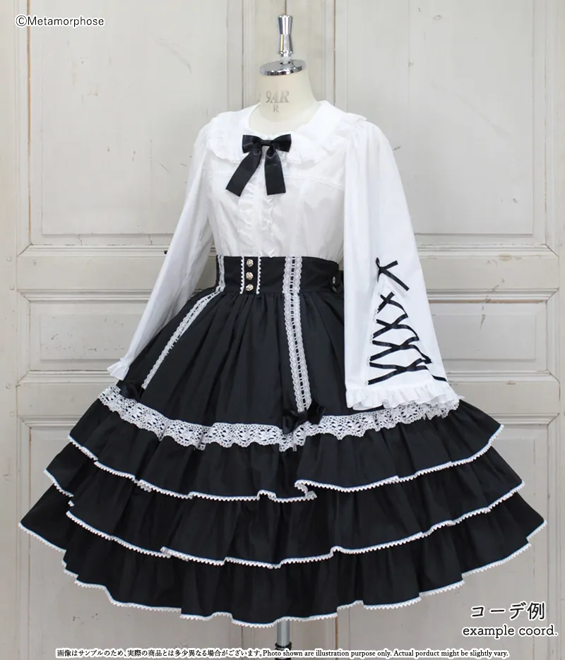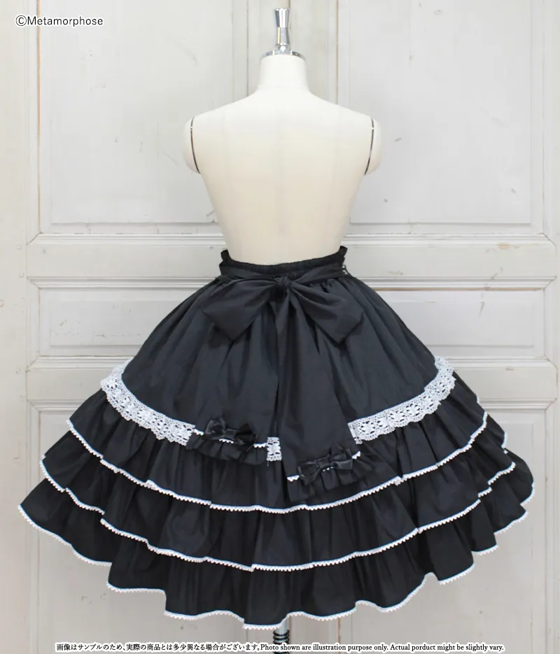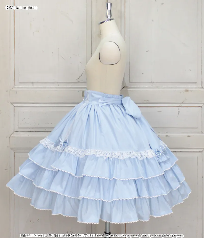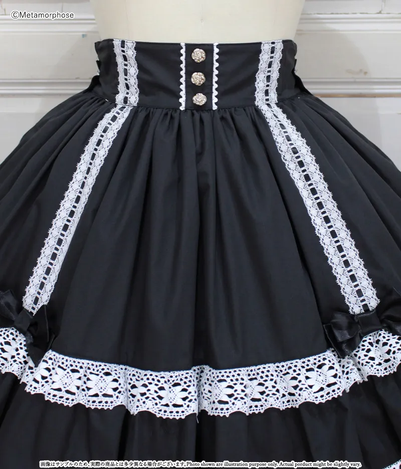 リボンが通った繊細なはしごレースと重なり合うたくさんのフリルでロリータファッションならではのたっぷりスカートが広がるふわふわ感を楽しんで♪