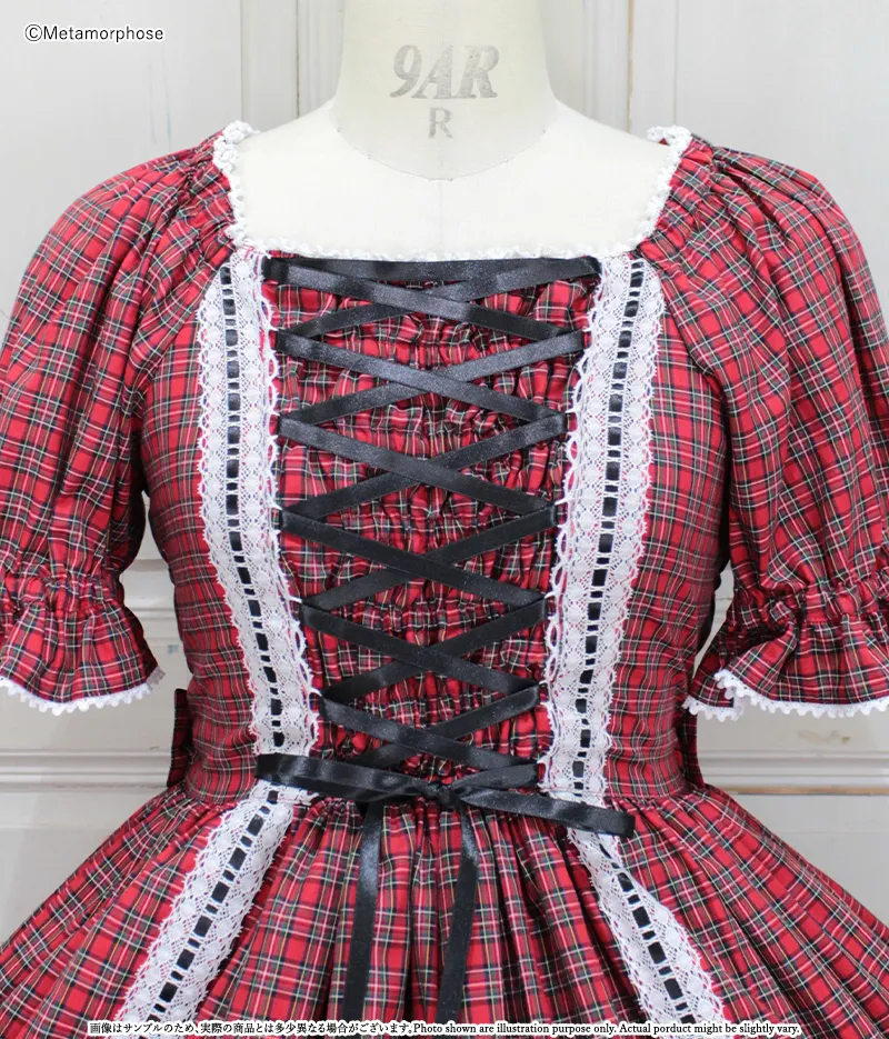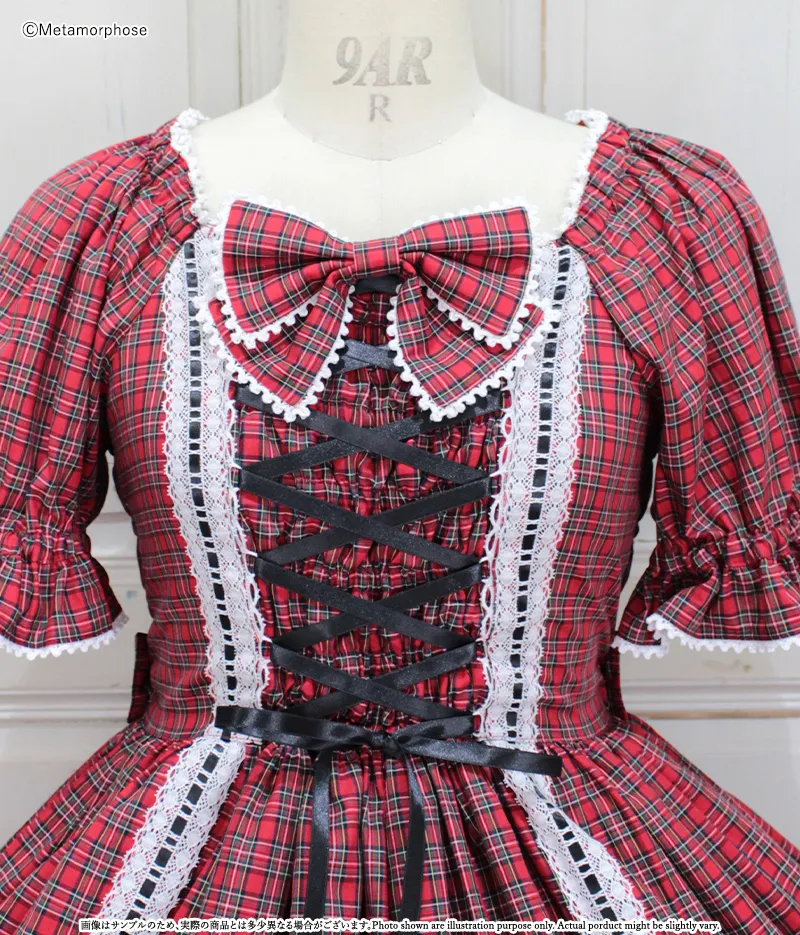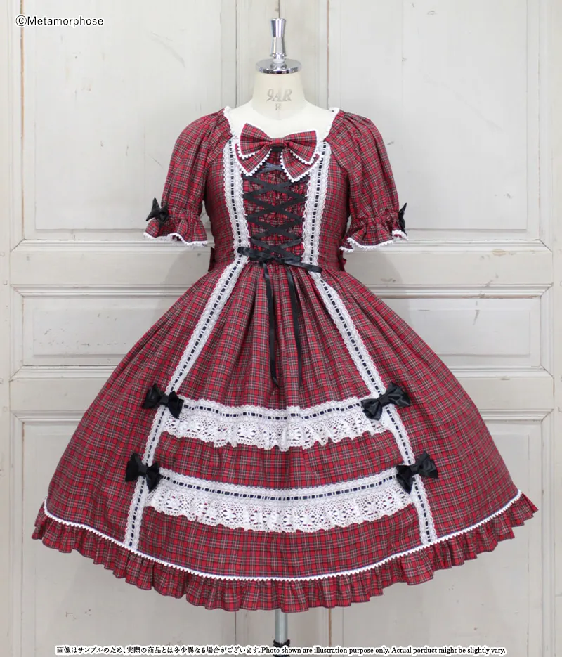赤チェック×オフ白レース×黒リボン×黒釦