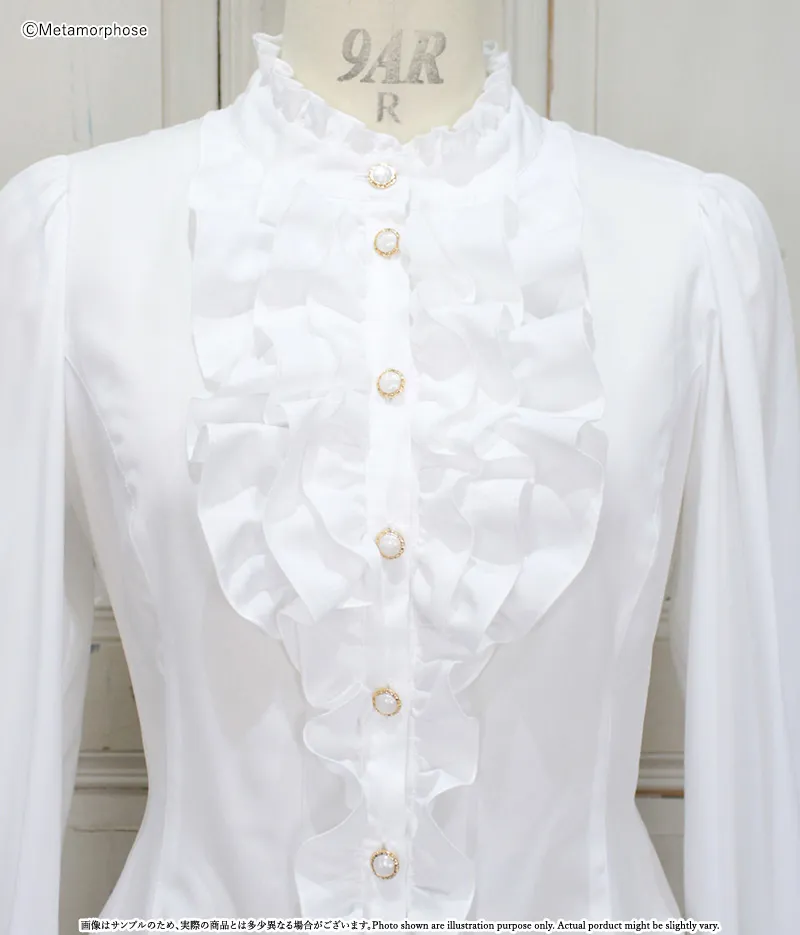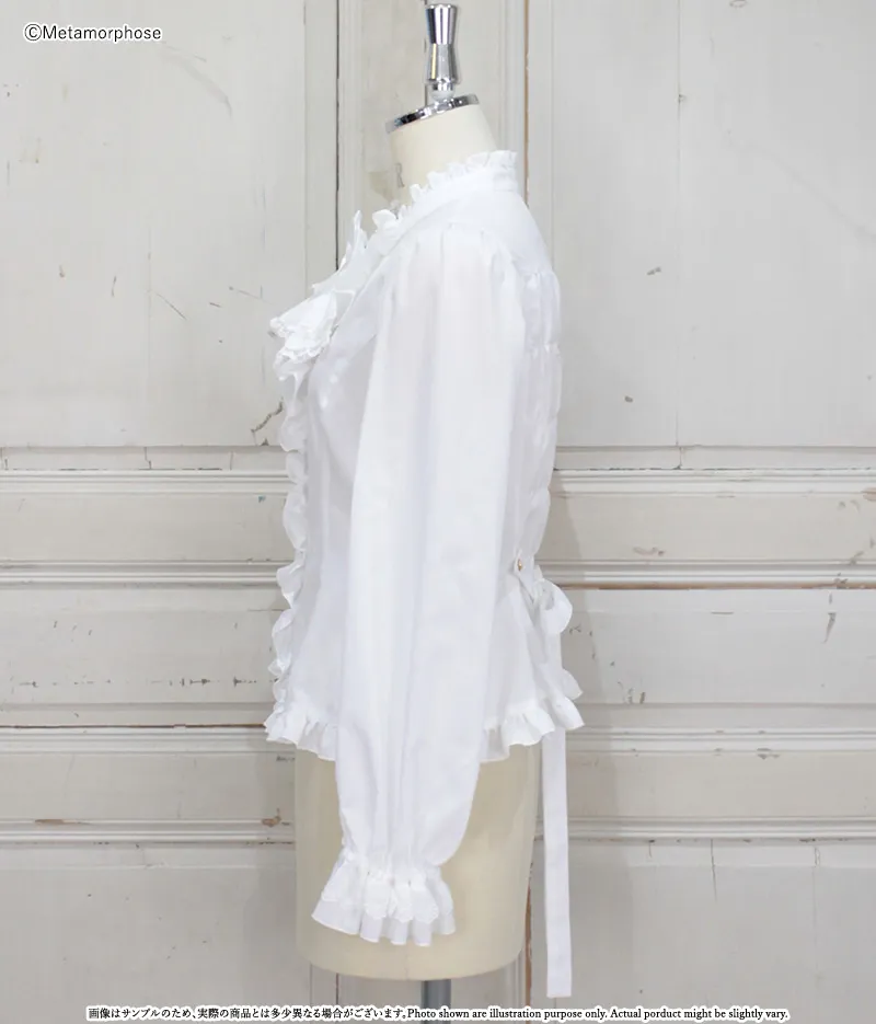 チュールレースが美しい大きなフリルジャボがポイントのブラウスです。